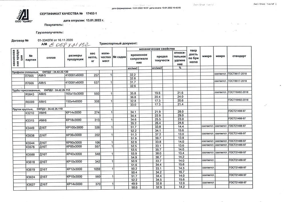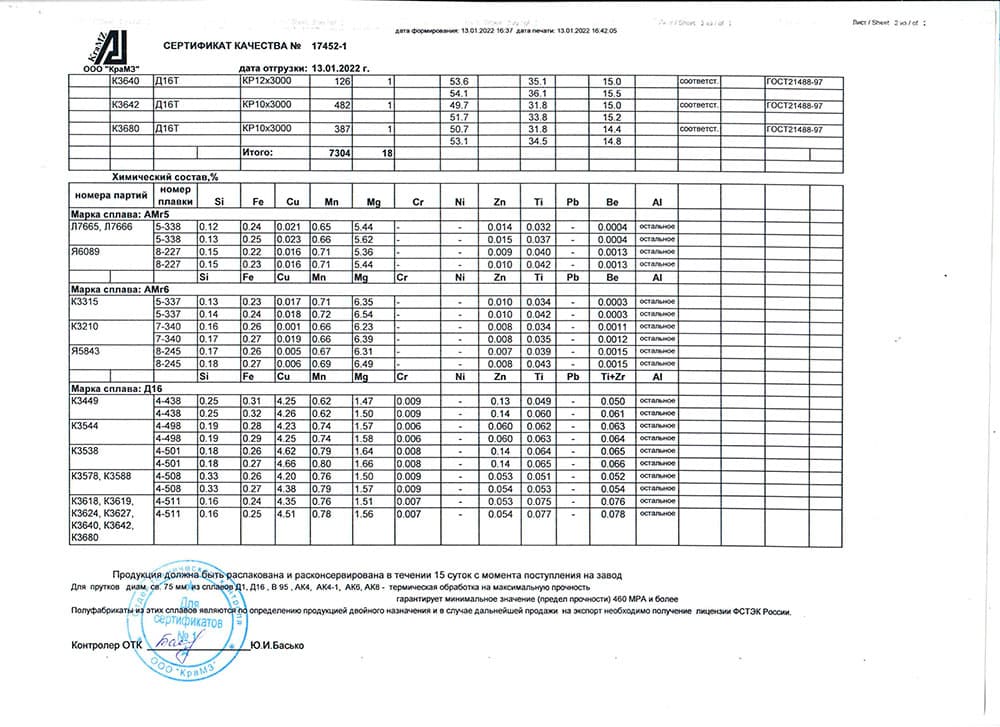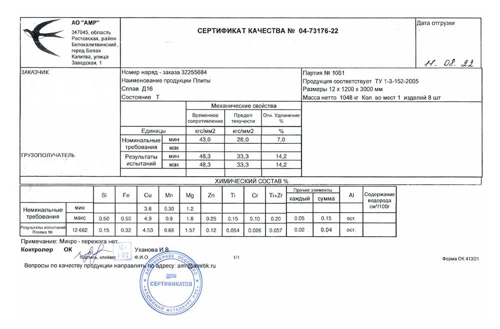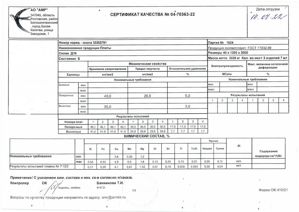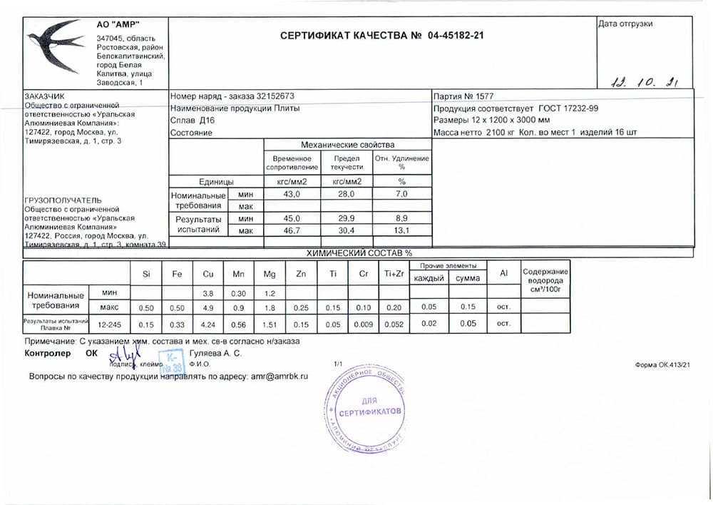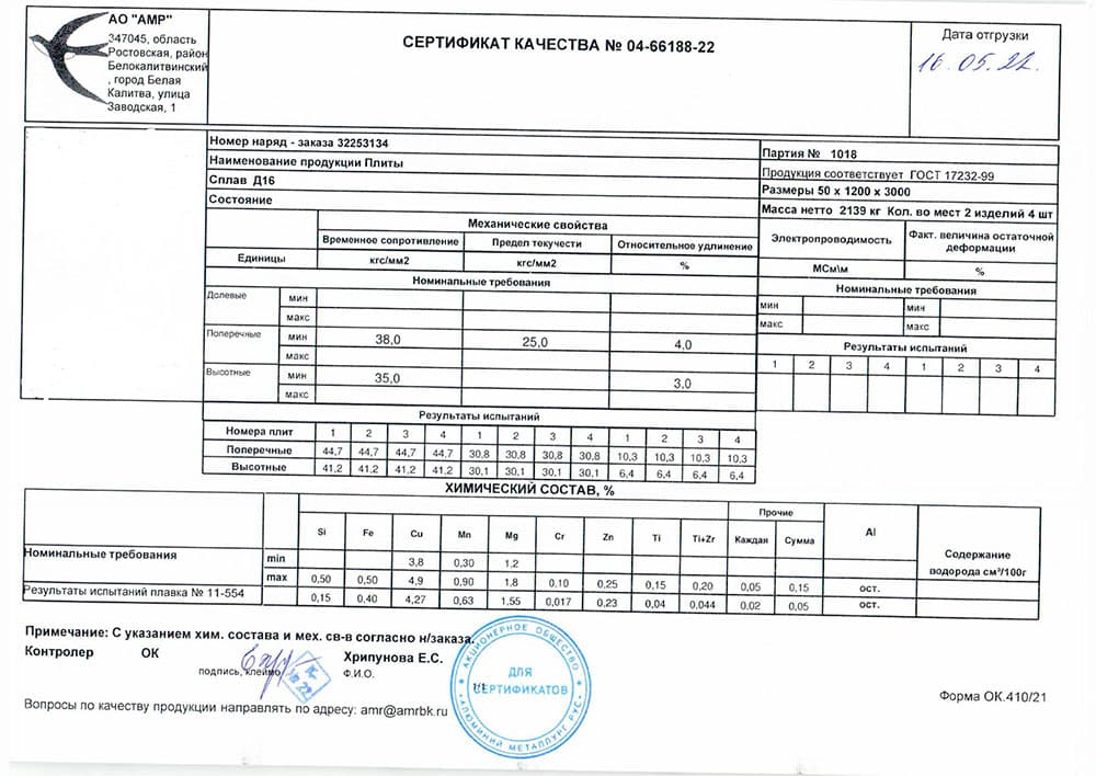 • Д16 – состав сплава: алюминий — 90,7–94,6%, медь — 3,7–4,8%, магний — 1,3–1,7%, железо — до 0,5%, кремний — до 0,5%, марганец — 0,3–0,9%, никель — до 0,1%, титан — до 0,1%, цинк — до 0,3%.