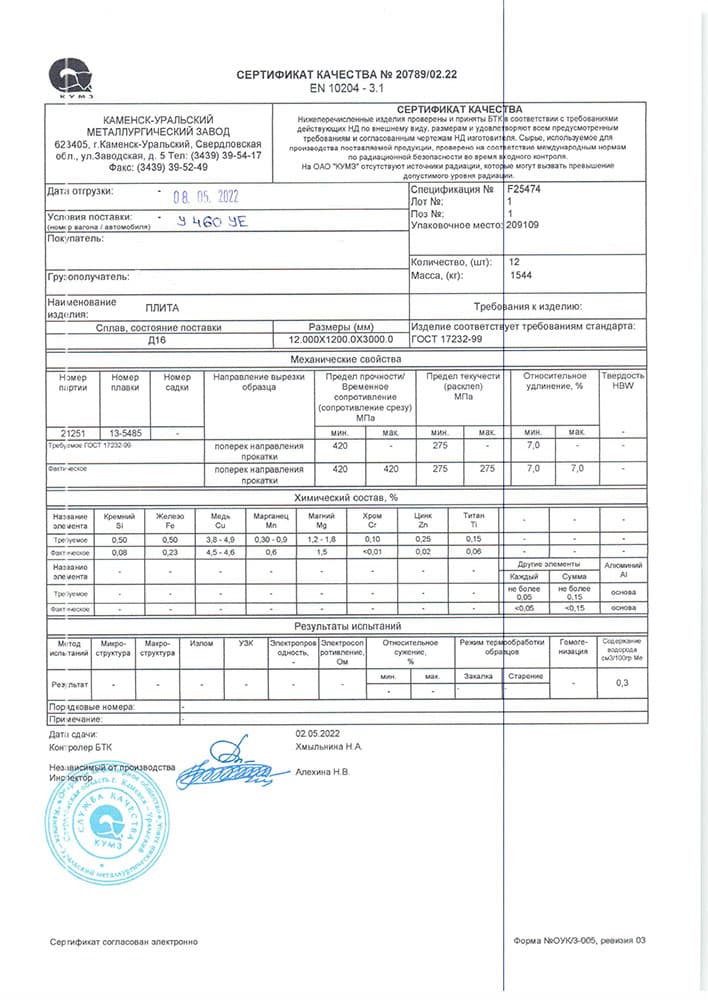 Плита дюралевая Д16Т 12x1500х3000 789 руб / 1 кг Заказать