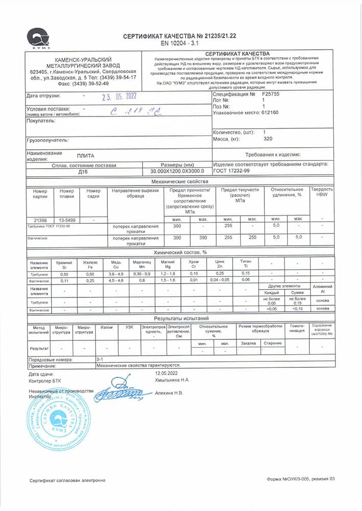 Плита дюралевая Д16Т 22x1500х3000 789 руб / 1 кг Заказать